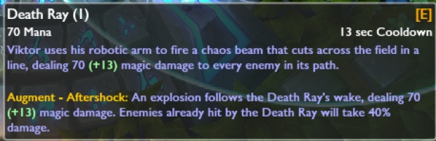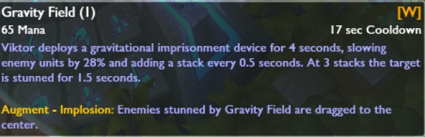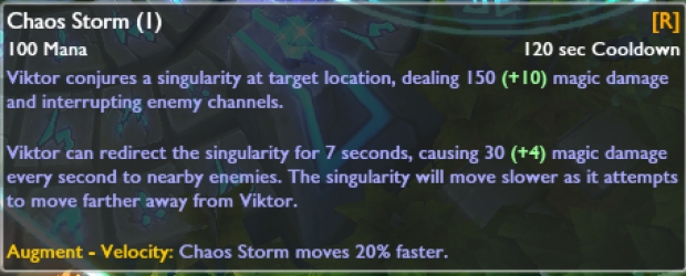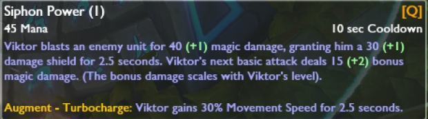 Bekleme süresi 10 / 8.5 / 7 / 5.5 / 4'şeklinde değiştirildi. Büyü Hasarı 40/60/80/100/120 (+ 0.2AP) şeklide azaltıldı. Kullanıldığı takdirde verdiği kalkan 30/50/70/90/110 şeklinde arttırıldı. Yeteneği kullandıktan sonra ilk normal vuruş belirli bir büyü hasarı veriyor (Seviyeye bağlı olarak 15-250 arası + 0.5 AP Oranı). Ayrıca bu yeteneği geliştirdiğiniz takdirde Viktor yeteneği kullandıktan sonra 2.5 saniyeliğine %30 hareket hızı kazanacak. Yeteneğin mesafesi 100 birim arttırıldı.