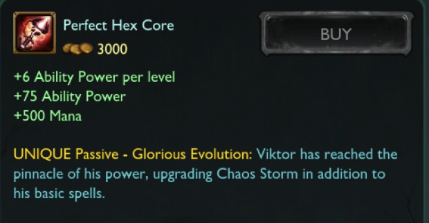 Viktor Prototip ile başlar. 1000 altın karşılığında 3 defa geliştirebilir. Her geliştirmede 25 AP, 150 Mana seviye başına +1 AP kazanır. Toplamda 75 AP, seviye başına +6 AP ve 500 Mana kazanır.